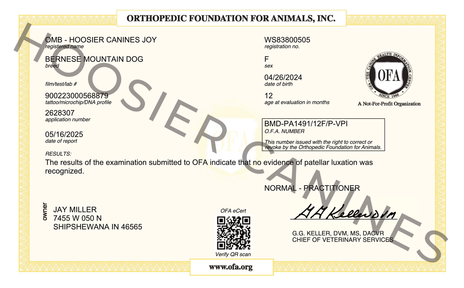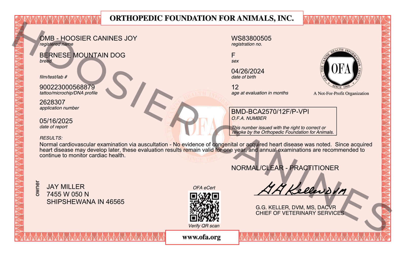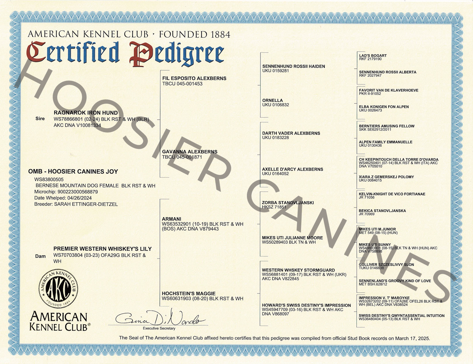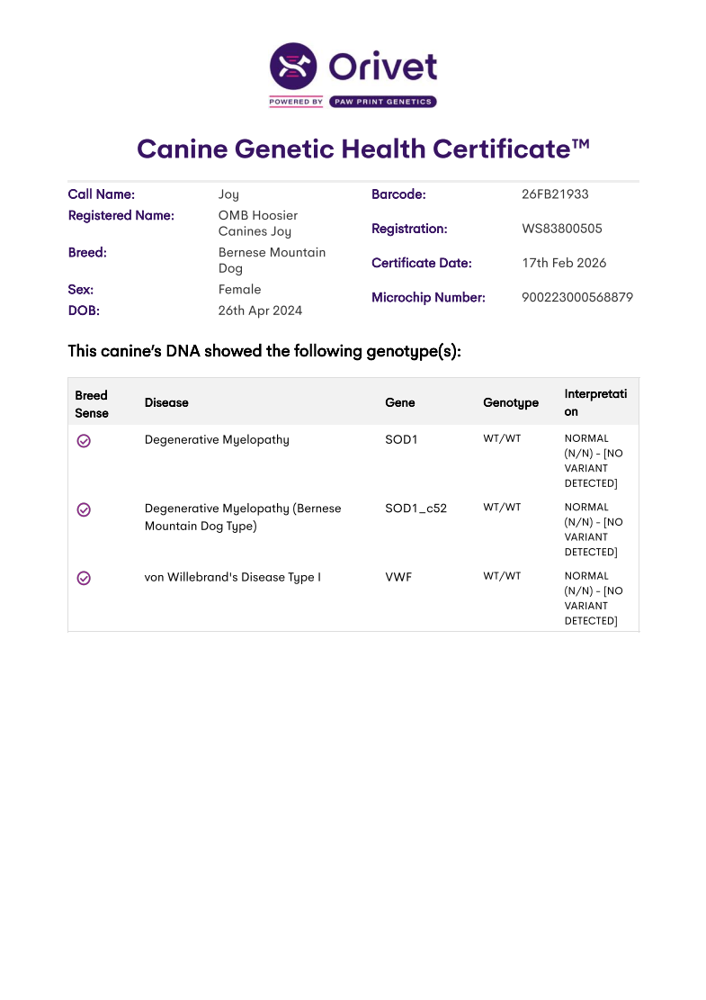 Joy is a sweet, affectionate Bernese Mountain Dog with an excellent structure. She comes from imported Russian champion bloodlines, adding both beauty and strong genetics to our breeding program.