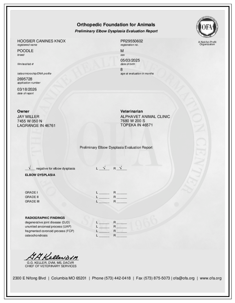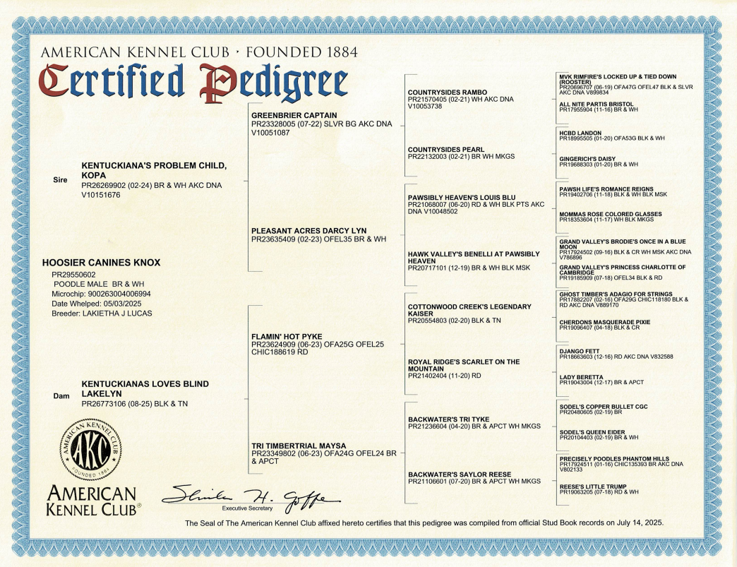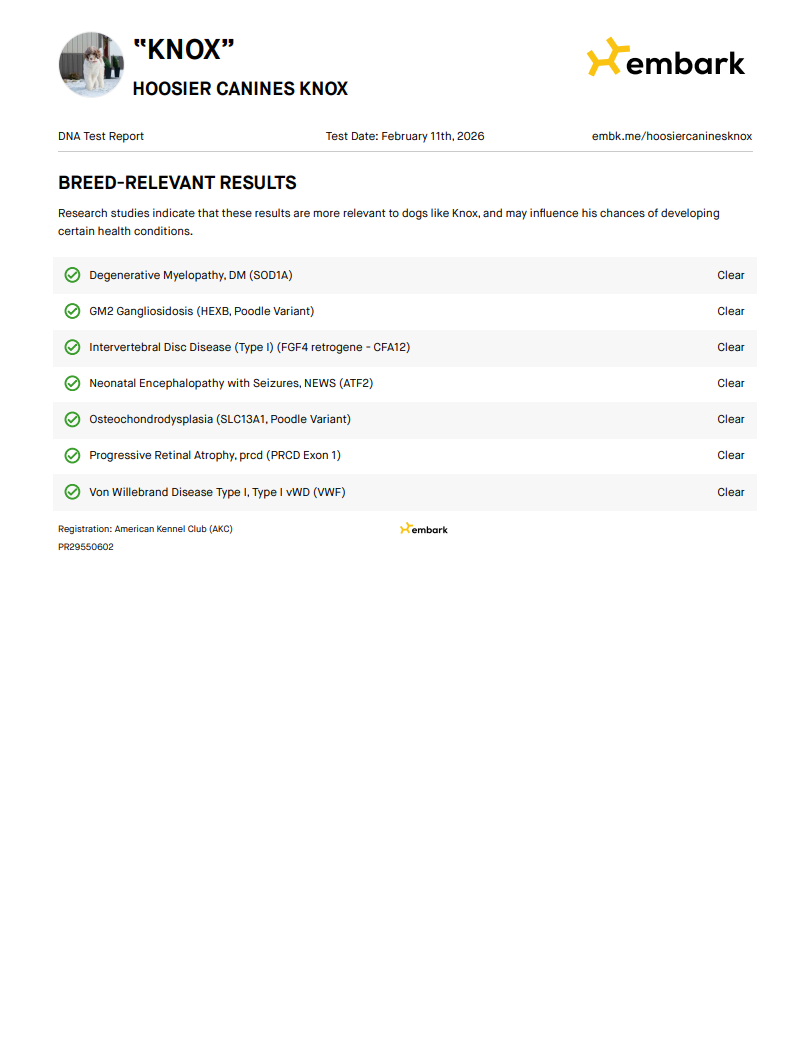Knox is a friendly, eager-to-please poodle who comes from excellent bloodlines. He carries exceptional genetics that allow him to produce both Traditional Tri-Color and Merle Tri-Color Bernedoodles. Knox has a wonderful temperament and is a great addition to our breeding program. Knox comes from health tested parents.