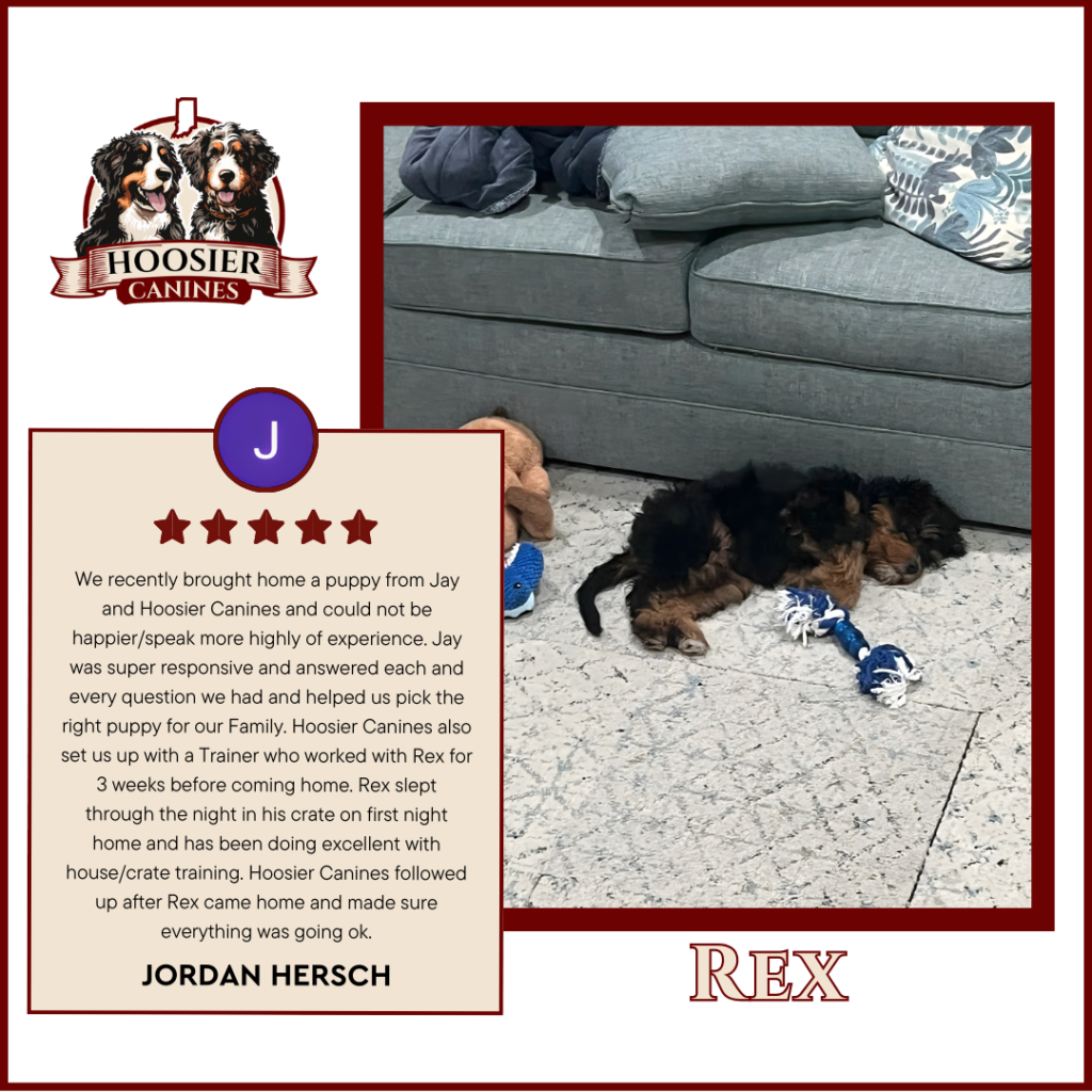 Posted on Gianna KonckiFebruary 28, 2026Trustindex verifies that the original source of the review is Google. Jay and his family at Hoosier Canines love and care for each puppy so well! We’ve had our LunaBella for 4 months now and she is hands down the best pup we’ve ever had. Immensely smart, gentle and loves pleasing my husband and I! She is the best addition to my practice and loves being with hospice patients. Thank you Jay!Posted on Kas MillerFebruary 23, 2026Trustindex verifies that the original source of the review is Google. We purchased a standard Bernedoodle in December 2025. We love her! The best dog, smart, playful, the best demeanor, great with kids, and really fits in perfectly with our family. So in love with her. Jay was super easy to work with. Would definitely use them again.Posted on jennifer lothianFebruary 21, 2026Trustindex verifies that the original source of the review is Google. Highly recommend!! Our family is in Orlando and we got our boy from Hoosier Canines just before Christmas in 2025 and had a fantastic experience! Jay and his brother were easy to communicate with and answered all our questions as they came up. They shared links to help us prepare before his arrival and even have a kit you can purchase that has everything to get started if needed. Most of all they are honest and transparent with everything, which helped so much with purchasing a puppy so far from home. We would absolutely use them again if we ever decided to add to our family!Posted on Brian PalmerFebruary 20, 2026Trustindex verifies that the original source of the review is Google. Hoosier Canines is an outstanding breeder with amazing puppies! From the time I inquired about adopting a puppy to the moment Baxter arrived, and of course throughout the puppy parenting process, I have incredible gratitude to Jay Miller and his family and organization for doing such a great job. There are a lot of reasons you should consider adopting from Hoosier Canines (thorough health and genetic testing, incredible care for the puppies from the day they are born, amazing mom & dad dogs) but one of the things I think is a key differentiator is the Early Neurological Stimulation (ENS) they do for their pups. My puppy seemed to be okay with exposure to anything after a few instances and I think ENS really helped with that. Here are photos of Baxter (3 of 16-17 weeks and 1 when we I got him at 8 weeks old). He's the best!!Posted on Maggie BroekhuisFebruary 16, 2026Trustindex verifies that the original source of the review is Google. My husband and I got our puppy from Hoosier Cannies and we loved our experience. The facilities were clean and the breeder is very knowledgeable and helpful. He was willing to answer our questions and was quick to respond. We just adore our little puppy. She is so social and loves everyone- dog or person! She is so sweet, loving, and loyal. A true companion! Would use them again in a heart beat!Posted on Morgan CowherdJanuary 25, 2026Trustindex verifies that the original source of the review is Google. We have adopted two bernedoodles from Jay. Our experience was wonderful on both occasions. Jay really cares about finding the right match for your family. Both of ours girls have excellent demeanors which are beyond perfect for our young children and they are loved by all that meet them! There’s not doubt that we will be getting our next furry family member from Hoosier!Posted on Emily BartleJanuary 15, 2026Trustindex verifies that the original source of the review is Google. We had an amazing experience with Hoosier Canines and cannot recommend them enough. We got our puppy, Luna, in November and she has been the perfect addition to our family. From the very beginning, Jay, the owner of Hoosier Canines, was nothing but wonderful to work with. His communication was excellent—he was responsive, helpful, and always willing to answer any questions we had throughout the entire process. He was also very upfront and transparent about all information, which we truly appreciated. We are from Chicago and Jay is based in Indiana. At first, I was a little nervous since I had never met him and had never even heard of the town he was located in. However, from our very first conversation, he made us feel completely comfortable and confident in our decision and trusting him was one of the best choices we made. Luna has been incredibly healthy, and even our veterinarian was pleasantly surprised at how great her health was, noting that she came with no complications. This really speaks volumes about the care and attention Jay provides to his puppies. Bringing a puppy into a home with a one-year-old can feel overwhelming, but Luna fit right in with our family from day one. She has such a great temperament, and it’s clear she was raised with care and love. The entire experience was smooth, professional, and reassuring, which made such a big difference for us as a family. You can truly tell that Jay is passionate about what he does and genuinely cares about both his dogs and the families they go to. We are beyond happy with our decision to go through Hoosier Canines and will absolutely be coming back to Jay when we are ready to add another puppy to our family. If you’re looking for a breeder who is trustworthy, communicative, and dedicated, Hoosier Canines is the place to go. ⭐⭐⭐⭐⭐Posted on Rebecca MJanuary 13, 2026Trustindex verifies that the original source of the review is Google. We are so very grateful for Hoosier canines!! Our addition to the family has been wonderful, we love her so much..definitely a special one🥰 Thank you!!Posted on Amanda HooperJanuary 8, 2026Trustindex verifies that the original source of the review is Google. We had a wonderful experience with Hoosier Canines and absolutely love our Ultra Bernedoodle! Communication was excellent throughout the entire process, and we really appreciated being able to visit her multiple times as a puppy. The breeder was